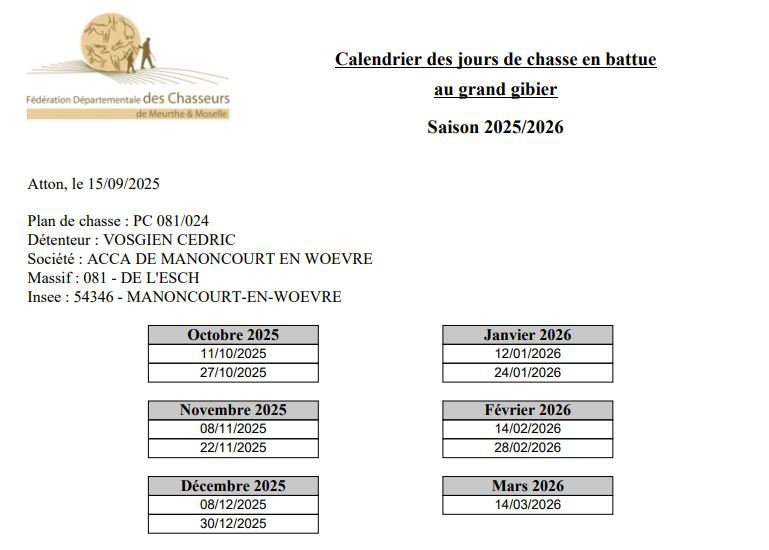 Pour connaitre les jours de chasse DU MASSIF DE L'ESCH (8A) voici le lien